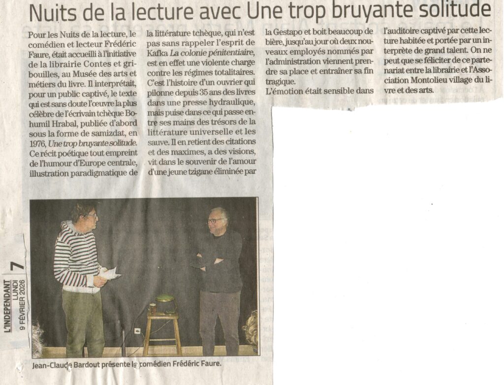 24 Janvier 2026 : Nuit de la lecture au Musée du Livre de Montolieu – en partenariat avec la librairie Contes et Gribouilles : lecture performance de Frédéric Faure autour