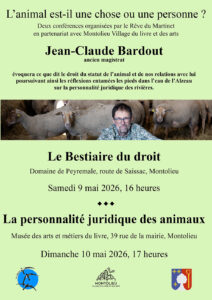 Jean-Claude Bardout, ancien magistrat, évoquera ce que dit le droit du statut de l’animal et de nos relations avec lui au cours de deux conférences. Il poursuivra ainsi les réflexions entamées, les pieds dans l’eau de l’Alzeau, sur la personnalité juridique des rivières [1].