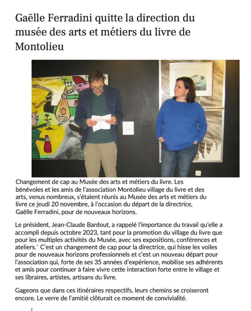 Confrontée à des difficultés financières et à la nécessité de réorganiser ses activités, l’association Montolieu village du livre poursuit son action grâce à la mobilisation des adhérents, des bénévoles et sympathisants. Depuis le mois d’octobre, notre association ne dispose plus de salariées, ce qui a amené le bureau à prendre en charge la gestion et l’activité de l’association, à suspendre certaines actions ou à reporter certaines d’entre elles tout en engageant une réflexion sur son avenir.
